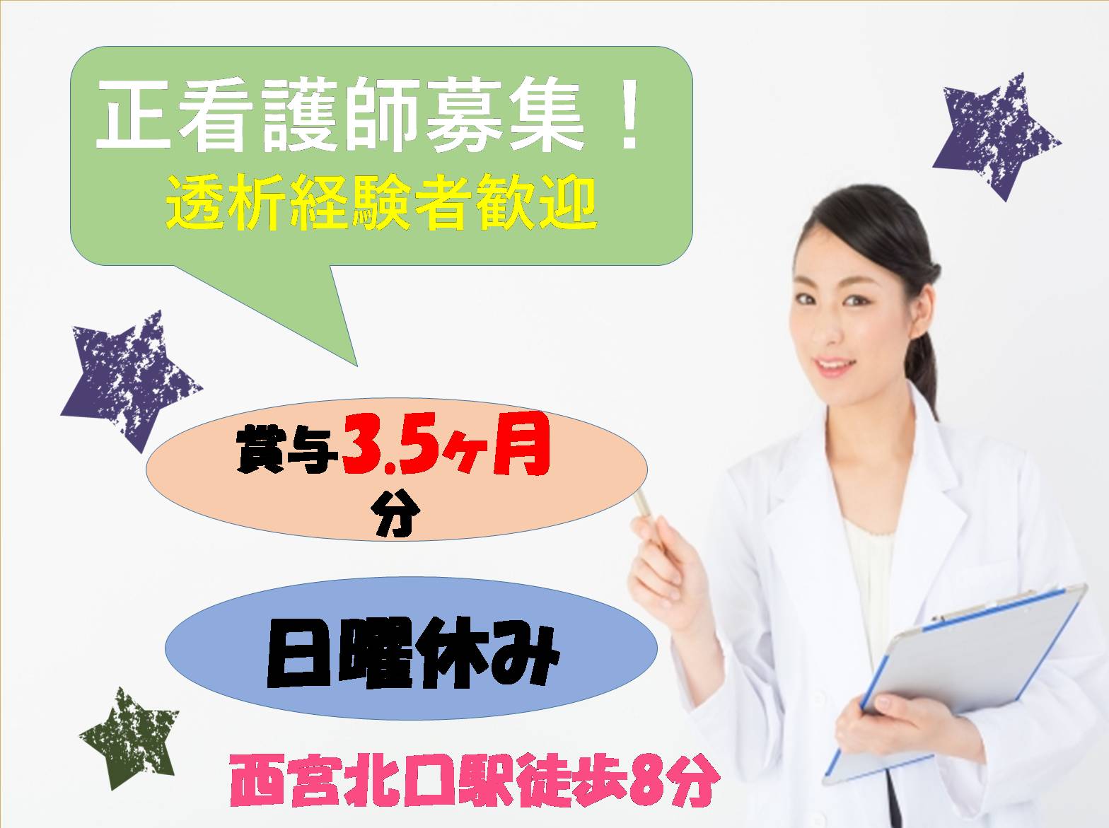 【正社員】【西宮市】透析病院の正看護師募集!賞与3.5ヶ月分!日曜定休日!