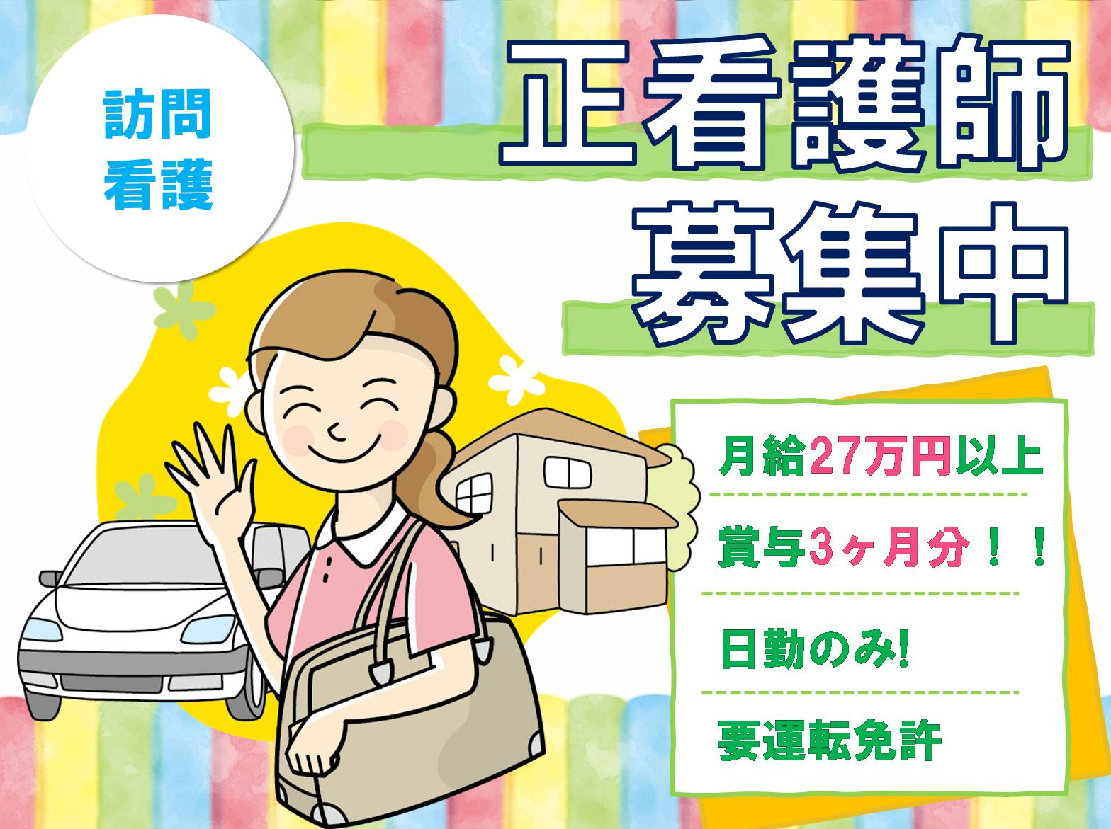 訪問看護の正看護師で賞与3ヶ月分月給27万円以上の週休2日オンコールあり要運転免許雇用形態