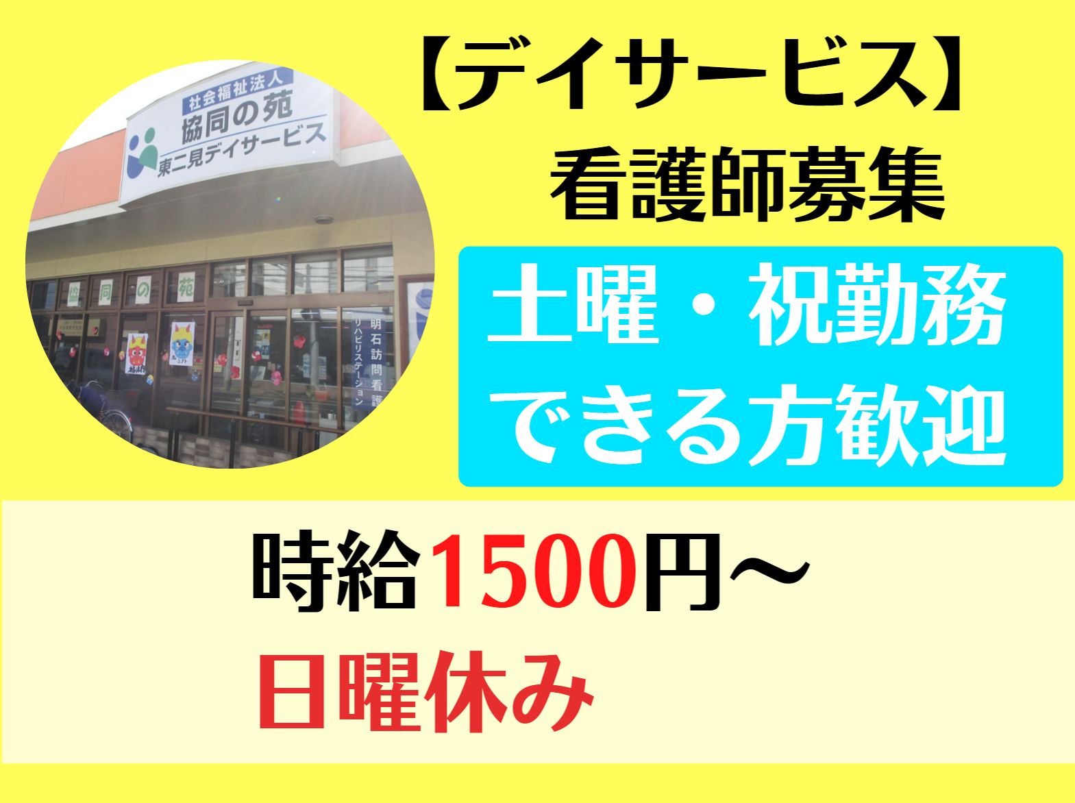 明石市/デイ/看護師/寸志あり/時給1500円以上/日曜休み/准看相談可能アクセス