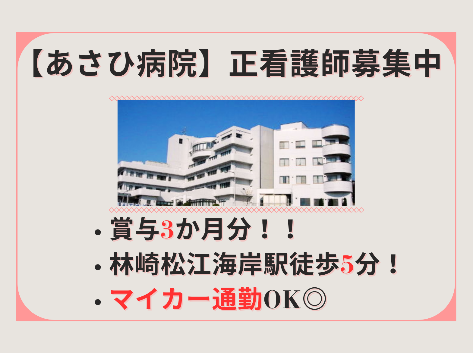 【正社員】【明石市】あさひ病院の病棟正看護師募集!!賞与3ヶ月分!林崎松江海岸駅から徒歩5分◎2交代制!