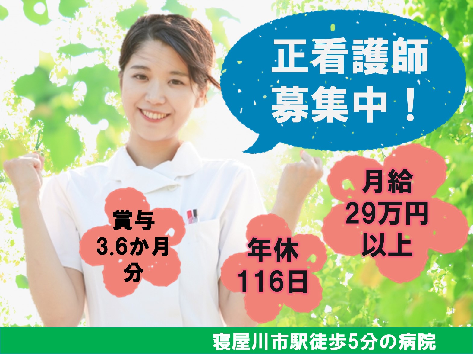 【正社員】【寝屋川市】病院の正看護師募集!!賞与3.6か月分!!年間休日116日!!寝屋川市駅より徒歩5分♪