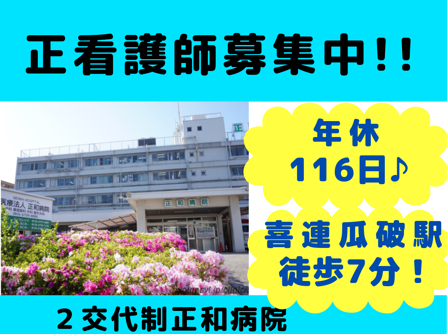 【正社員】【大阪市平野区】正和病院 の正看護師募集!!2交代制!年間休日116日!最寄り駅徒歩7分!